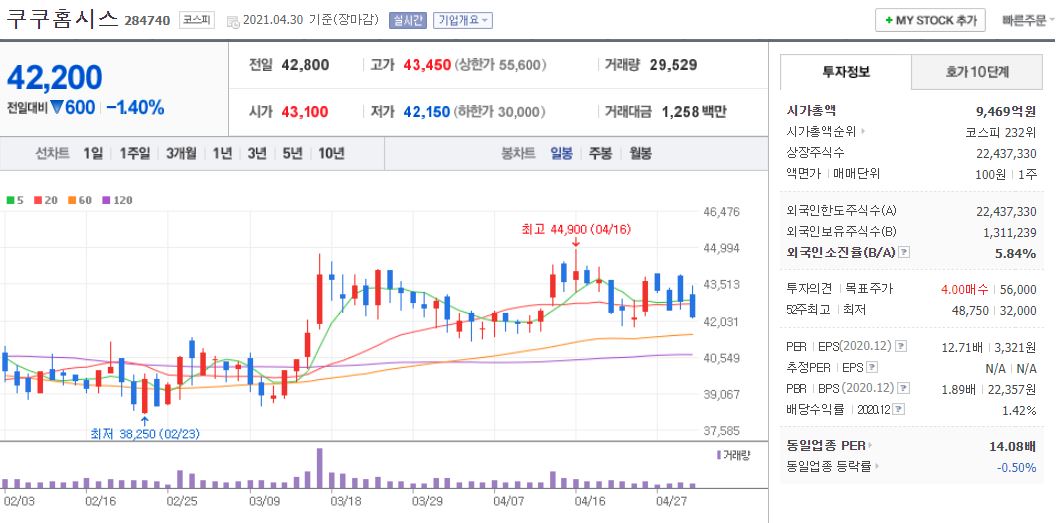 쿠쿠홈시스의 경우 21년 4월 30일 기준, 42,200원이며 시가총액 9,469억원, 코스피 232위의 기업입니다. 상장주식수는 22,437,330주에 액면가 100원이고 네이버 금융의 펀더멘털을 보면 20년 PER는 12.71배, 21년 PER 9.31배입니다. 재무제표 요약을 보면 매출액, 영업이익, 당기순이익은 18년부터 21년까지 지속적으로 우상향하고 있는 기업입니다. 부채비율도 18년 35% 수준에서 점차 감소하고 있어 21년은 27% 수준에 현금 배당금은 20년 기준 600원으로 재무제표 등의 수치로는 괜찮은 회사인 것 같습니다.