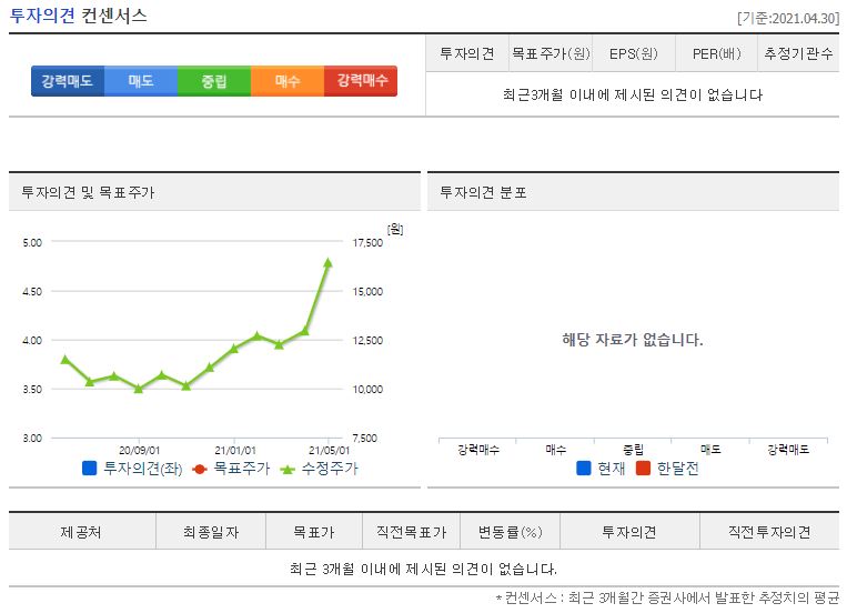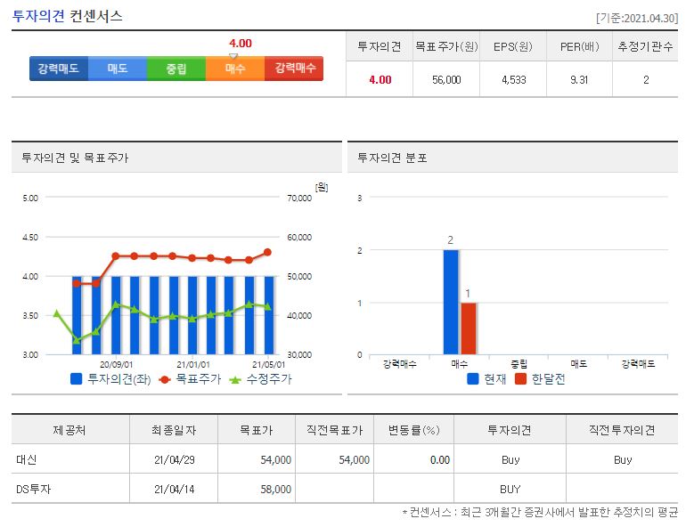 2021년에만 2개의 증권사에서 리포트가 있었는데요, 전체적으로 투자의견은 매수였습니다. 제일 낮은 곳이 4월 29일에 발표한 대신의 54,000원이었고 제일 높은 곳은 4월 14일에 발표한 DS투자의 58,000원이었습니다. 참고로 네이버 금융의 투자의견 컨센서스는 56,000원이네요. 4월 30일 기준 42,200원이므로 11,800원~13,800원 정도의 상승여력이 있네요.