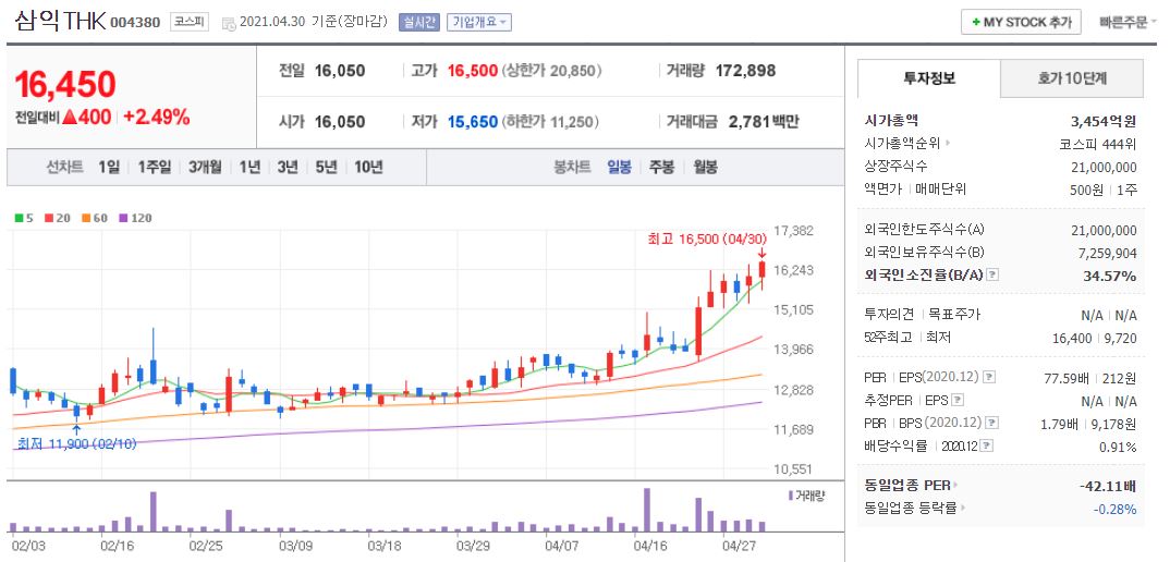 삼익THK의 경우 21년 4월 30일 기준, 16,450원이며 시가총액 3,454억원, 코스피 444위의 기업입니다. 상장주식수는 21,000,000주에 액면가 500원이고 네이버 금융의 펀더멘털을 보면 20년 PER는 77.48배입니다. 재무제표 요약을 보면 18년부터 19년까지 매출액, 영업이익, 당기순이익은 감소했다가 20년부터 다시 상승하고 있습니다. 부채비율은 18년 89%에서 조금 증가하여 약 104% 수준이며 현금배당금은 20년 기준 1주당 150원입니다.