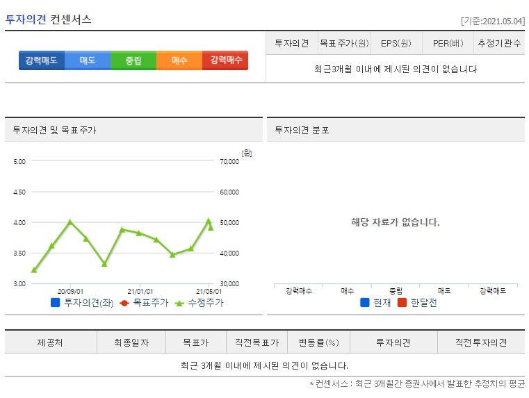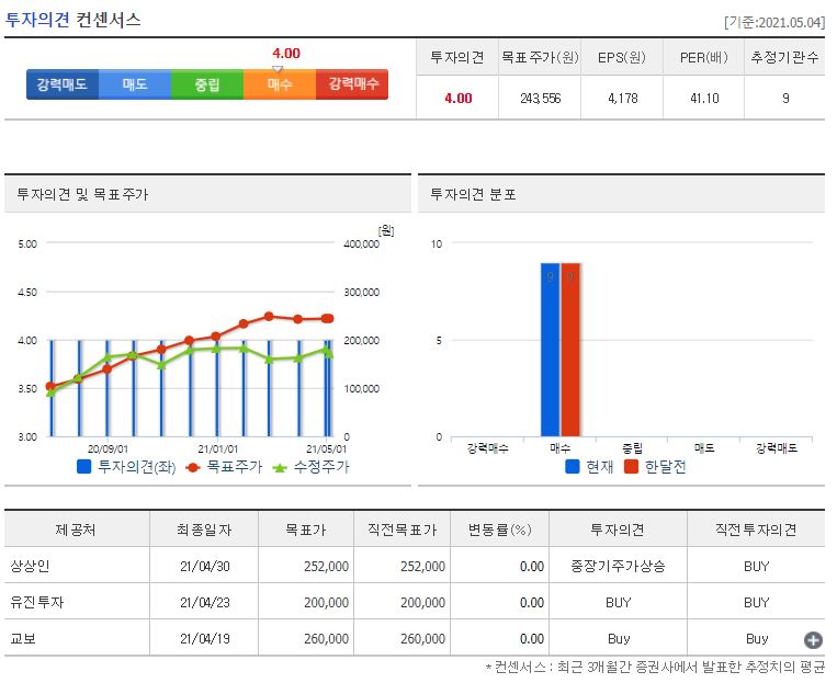 2021년에만 3개의 증권사에서 리포트가 있었는데요, 전체적으로 투자의견은 매수였습니다. 제일 낮은 곳이 4월 23일에 발표한 유진투자의 200,000원이었고 제일 높은 곳은 4월 19일에 발표한 교보의 260,000원이었습니다. 참고로 네이버 금융의 투자의견 컨센서스는 243,556원이네요. 5월 4일 기준 171,700원이기 때문에 최저가까지도 28,300원, 최대가 까지는 88,300원의 상승여력이 남아있습니다.