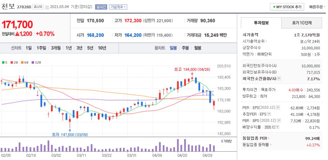 천보의 경우 21년 5월 4일 기준, 171,700원이며 시가총액 1조 7,170억원, 코스닥 24위의 기업입니다. 상장주식수는 10,000,000주에 액면가 500원이고 네이버 금융의 펀더멘털을 보면 20년 PER는 62.79배, 21년 PER 41.10배입니다. 재무제표 요약을 보면 매출액, 영업이익, 당기순이익은 18년부터 21년까지 지속적으로 상승하고 있습니다. 부채비율은 18년부터 25%였으나 21년 기준 18.82%이며 현금배당금은 20년 기준 1주당 240원으로 대략적인 수치상으로는 괜찮은 기업이라고 생각합니다.