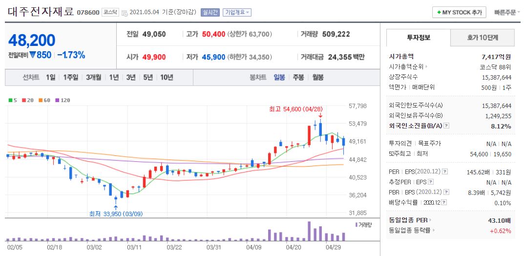 대주전자재료는 21년 5월 4일 기준, 48,200원이며 시가총액 7,417억원, 코스닥 88위의 기업입니다. 상장주식수는 15,387,644주에 액면가 500원이고 네이버 금융의 펀더멘털을 보면 20년 PER는 145.84배로 높은 편입니다. 재무제표 요약을 보면 18년부터 21년까지 매출액은 약 1,000억원에서 1,545억원으로 상승중이나 영업이익과 당기순이익은 19년에 하락한 후 재상승 중에있습니다. 부채비율은 18년부터 지속적으로 상승하여, 20년 기준 136% 수준입니다. 현금배당금은 20년 기준 1주당 50원입니다.