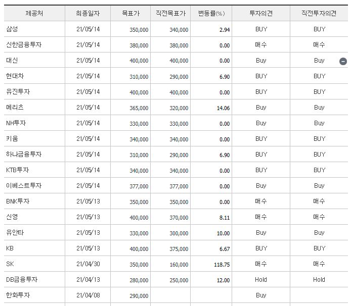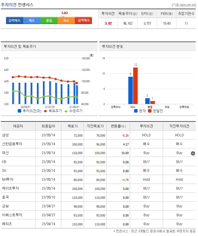 2021년에만 11개의 증권사에서 리포트가 있었는데요, 전체적으로 투자의견은 매수였습니다. 그렇지만 5월 14일에 삼성과 NH투자에서는 HOLD 의견도 2곳이 있었습니다. 목표가가 제일 낮은 곳은 5월 14일에 발표한 삼성의 72,000원이었고 제일 높은 곳은 4월 14일과 5월 14일에 발표한 메리츠, 흥국, 대신의 110,000원이었습니다. 참고로 네이버 금융의 투자의견 컨센서스는 96,182원이네요.