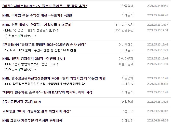 NHN의 주요제품 매출 구성을 보면 결제 및 광고가 39.23%, 게임이 27.46% 되는 회사인데요. 1분기 매출액과 영업이익은 전 분기 대비 0.8%, 45.5% 증가한 4,599억원, 292억원이었습니다. 특히 게임 매출이 13.3% 증가했다고도 하네요. 그렇지만 특이했던 점은 커머스와 기술 부문이 4분기가 최대임에도 매출 성장세를 보이고 있고 페이코 역시 오프라인 결제액도 전년 동기 대비 45% 증가했다고 합니다. 지난 실적 발표 컨퍼런스콜에서는 2025년까지 NHN고도, 글로벌, 클라우드의 상장을 검토하고 있다고 하네요.