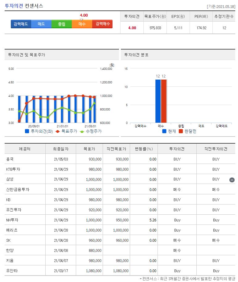 21년에 별도로 목표가를 제시한 증권사는 총 12곳이었습니다. 전체적으로 투자의견은 매수이고 가장 낮은 목표가를 4월 8일 발표했던 한양의 880,000원이었습니다. 가장 높은 곳은 4월 28~29일에 발표한 삼성, 신한금융투자, NH투자, 메리츠의 1,000,000원이네요. 참고로 네이버 투자의견 컨센서스는 975,833원입니다. 5월 14일 기준 894,000원이기 때문에 네이버 투자의견 컨센서스의 목표가나 가장 높은 곳의 목표가를 비교해본다면 아직 80,000~100,000원 정도의 상승여력이 있어 보입니다.