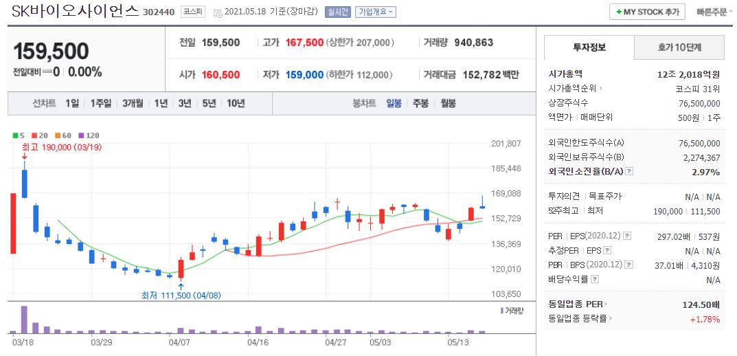 다만 아쉬운 건, 2021년 상장했다 보니 아직 증권사 리포트가 나온 곳이 없어서 전체적인 투자의견이나 목표가에 대한 정보가 없다는 점이네요. 그렇지만 최근 SK바이오사이언스의 대표 동행 소식에 3.76% 오르기도 했다는 점과 한미 정상회담에서 호재가 나오면 더욱 상승할 수도 있다는 점 2가지를 같이 고려해서 공부해보시는 게 좋을 것 같습니다.