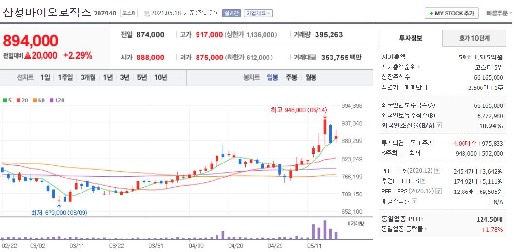 삼성바이오로직스의 경우 21년 5월 18일 기준, 894,000원이며 시가총액 59조 1,515억원, 코스피 5위의 기업입니다. 상장주식수는 66,165,000주에 액면가 2,500원이고 네이버 금융의 펀더멘털을 보면 20년 PER는 245.47배, 21년 PER는 174.92배입니다. 재무제표 요약을 보면 18년부터 21년까지 매출액, 영업이익, 당기순이익은 지속적으로 상승 중이며 21년 기준 매출액 1조 4,000억원, 영업이익 4,297억원, 당기순이익 3,470억원을 추정하고 있습니다. 부채비율은 18년 43%에서 조금씩 감소 추세로 21년 기준 약 42% 수준이며 현금배당금은 아직 없습니다.