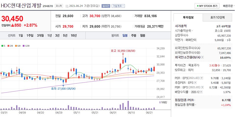 HDC현대산업개발의 경우 21년 6월 24일 기준, 30,450원이며 시가총액 2조 69억원, 코스피 150위의 기업입니다. 상장주식수는 65,907,330주에 액면가 5,000원이고 네이버 금융의 펀더멘털을 보면 20년 PER는 8.23배, 21년 PER 5.30배입니다. 재무제표 요약을 보면 19년까지 매출액은 크게 상승했다가 21년까지 감소하는 추세이지만, 영업이익은 20년까지 상승한 후 21년에 소폭 감소했고 당기순이익은 20년에 하락했다가 21년에 다시 상승했습니다. 매출액과 영업이익, 당기순이익이 뭔가 굉장히 따로 노는 듯한 느낌인데요. 21년 기준 매출액은 3조 3,872억원, 영업이익은 4,933억원, 당기순이익은 3,674억원입니다. 부채비율은 18년 163.69% 수준에서 점차 감소하고 있어 21년은 106.41% 수준입니다. 현금배당금은 20년 기준 1주당 600원에 현금배당수익률 2.3, 현금배당성향은 무려 17.96%입니다. 21년 역시 1주당 600원에 현금배당수익률은 2.03, 현금배당성향은 10.74%이네요