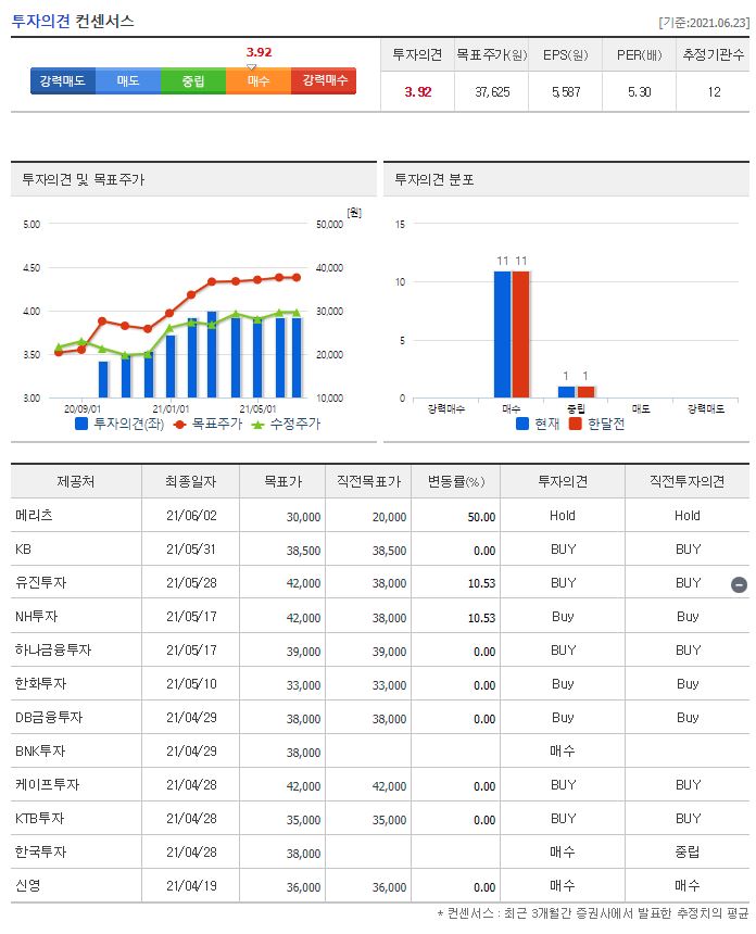 2021년에만 12개의 증권사에서 리포트가 있었는데요, 전체적으로 투자의견은 매수였으나 HOLD의견도 1개 있었습니다. 제일 낮은 곳은 HOLD 의견을 6월 2일에 발표한 메리츠의 30,000원이었고 제일 높은 곳은 4, 5월에 발표한 케이프투자, NH투자, 유진투자의 42,000원이었습니다. 참고로 네이버 금융의 투자의견 컨센서스는 37,625원이네요. 21년 6월 24일 기준 30,450원이기 때문에 최저가는 이미 도달했고 네이버 금융 투자의견 컨센서스와 비교하면 상승여력은 남아있는 것으로 보입니다. 그렇지만 제 개인적인 생각은 최근 광주 붕괴 이슈라던지 기업에게 치명적인 내용들이 있기 때문에 충분한 공부가 필요하다고 생각합니다.