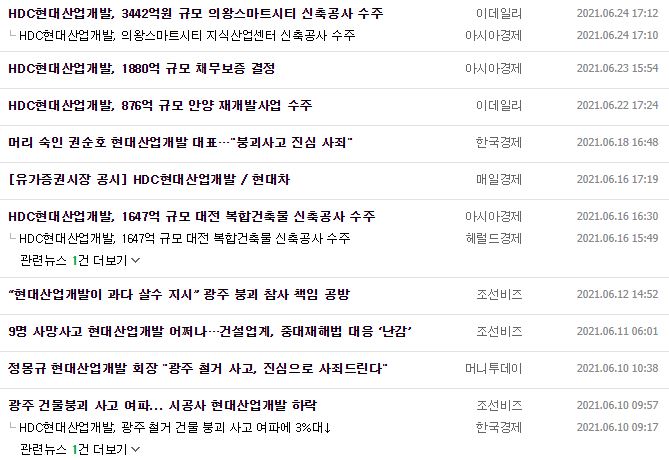 HDC현대산업개발 주요 제품 매출 구성을 보면 외주주택이 76.37%, 자체공사가 8.86%, 토목이 8.07% 수준인데요. 염승환 부장님께서 말씀하신 디벨로퍼는 자체공사에 해당되는 것 같습니다. 안타까운 점은 최근 광주에서 있었던 사업장 붕괴사고에 대해 원청업체인 HDC현대산업개발도 책임에서 자유롭지 못하다고 하는데요. 그런 일이 있음에도 불구하고 최근 876억 규모의 안양 재개발사업이나, 3,442억원 규모의 의왕 스마트시티 신축공사를 수주하기도 했습니다.