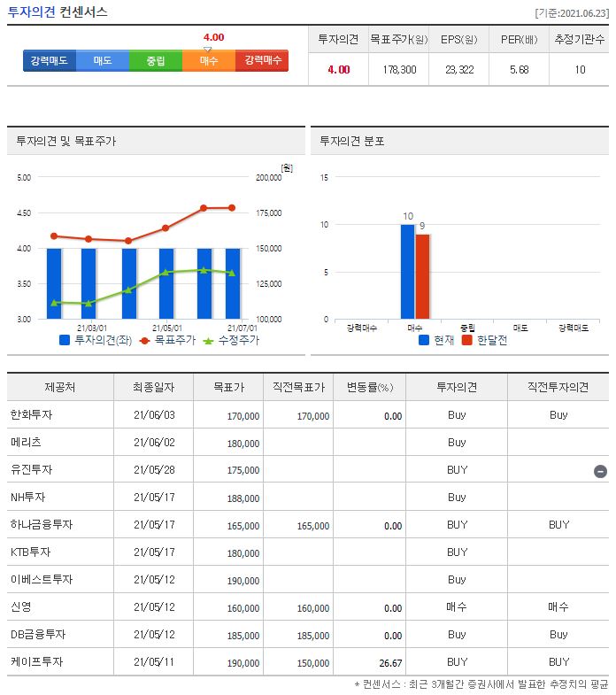 21년에 별도로 목표가를 제시한 증권사는 총 10곳이었습니다. 전체적으로 투자의견은 매수였는데요. 가장 낮은 목표가는 5월 17일에 발표한 하나금융투자의 165,000원이었습니다. 반대로 가장 높은 목표가는 5월 11, 12일에 발표한 케이프투자와 이베스트 투자의 190,000원입니다. 참고로 네이버 투자의견 컨센서스 목표주가는 178,300원인데요. 21년 6월 24일 기준 DL이앤씨는 135,500원이기 때문에 단순 목표주가만 본다면 최저가보다도 약 30,000원의 상승여력이, 네이버 컨센서스랑 비교해도 43,000원의 상승여력이 있는 것 같아요.