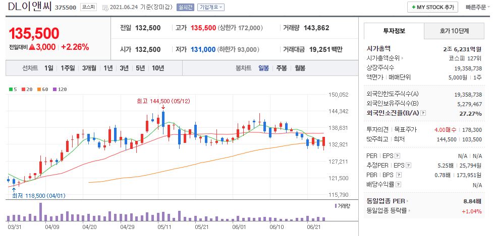 DL이앤씨의 경우 21년 6월 24일 기준, 135,500원이며 시가총액 2조 6,231억원, 코스피 127위의 기업입니다. 상장주식수는 19,358,738주에 액면가 5,000원이고 네이버 금융의 펀더멘털을 보면 21년 PER는 5.68배입니다. 재무제표 요약을 보면 21년 매출액은 6조 2,520억원, 영업이익은 7,480억원, 당기순이익은 5,463억원입니다. 2021년 1월 25일에 대림산업에서 인적분할하여 DL이앤씨로 상장되었다 보니 네이버 재무제표 요약에는 18~20년 내용이 없네요. 부채비율은 21년 90.28% 수준이며 현금배당금은 21년 기준 1주당 1,125원에 현금배당수익률 0.85, 현금배당성향은 4.38%입니다.