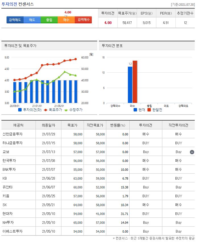 21년 최근 3개월간 목표가를 제시한 증권사는 총 12곳입니다. 투자의견은 전부 매수였는데요. 가장 낮은 목표주가는 5월 10일에 발표한 현대차와 이베스트투자의 54,000원이고 가장 높은 곳은 같은 날 발표한 NH투자의 65,000원이 있네요. 참고로 네이버 투자의견 컨센서스 목표주가는 58,417원인데요. 7월 31일 기준 44,250원이기 때문에 충분히 매력이 있어 보입니다.