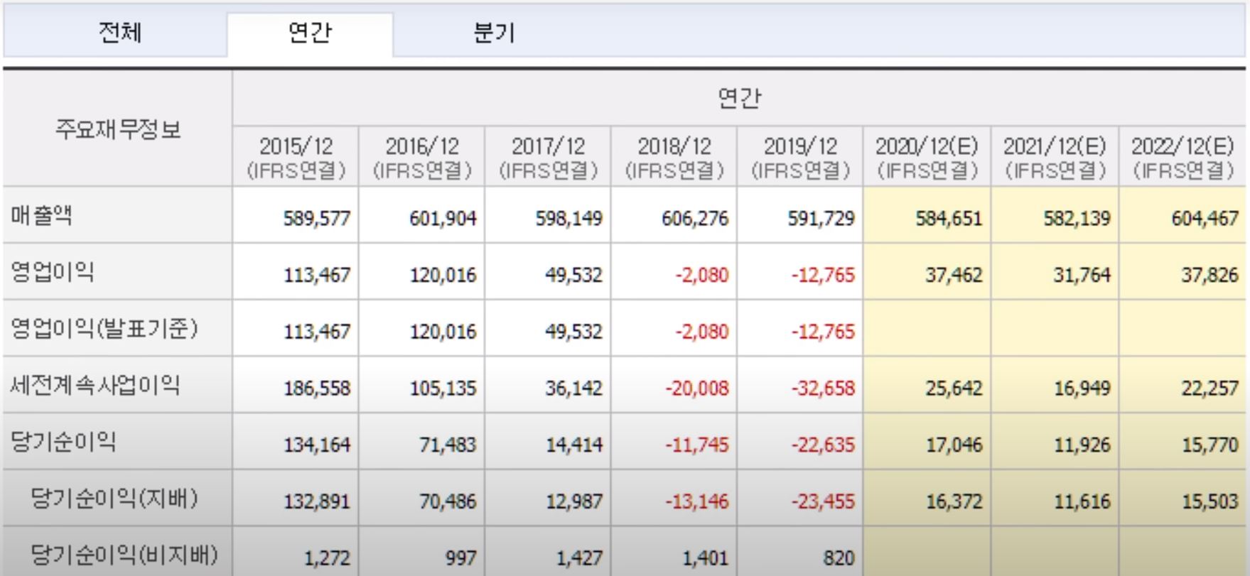당기순이익: 18년 -1조 1,745억원, 19년 -2조 2,635억원