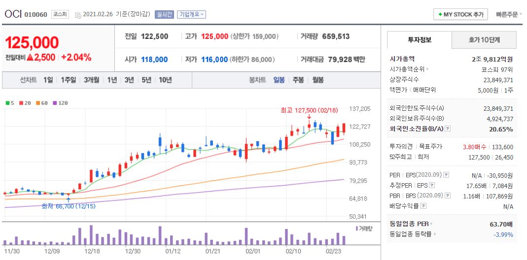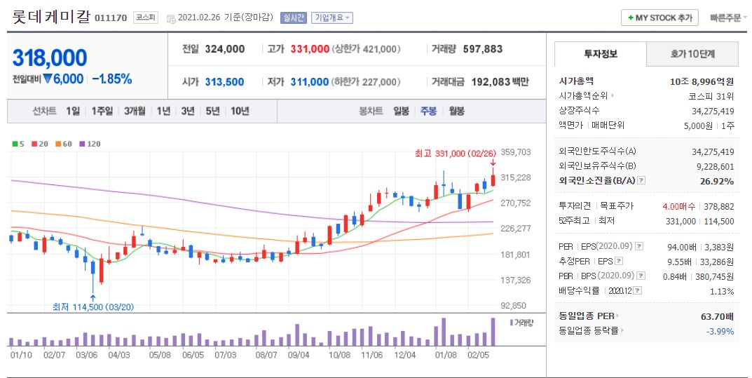 롯데케미칼의 2월 26일 주가는 318,000원이고