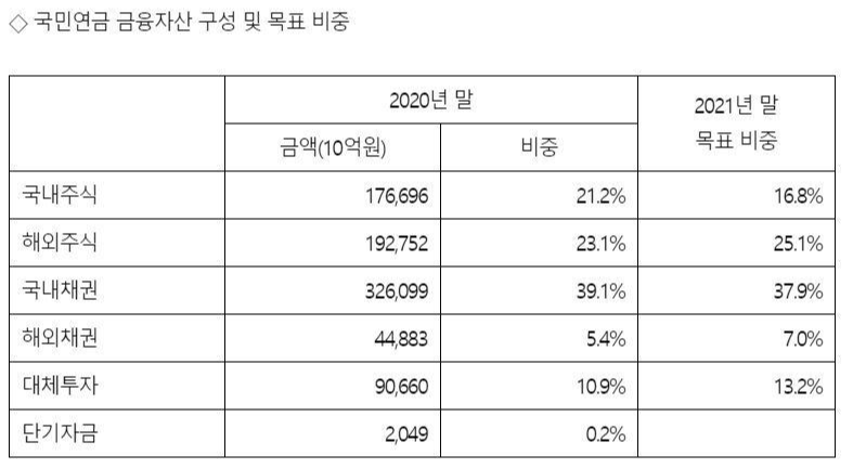 참고로 국민연금의 21년 말 금융자산 구성 및 목표 비중은