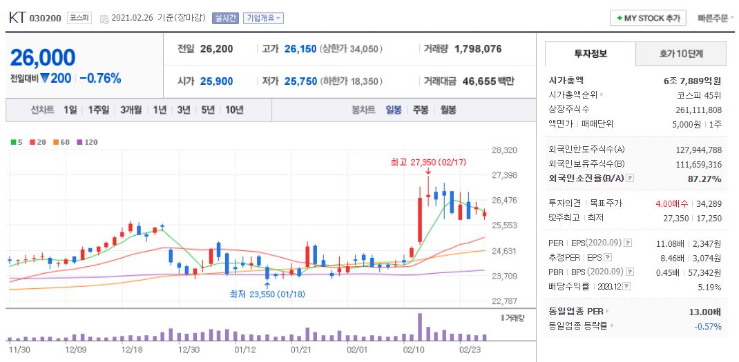 KT는 배당수익률이 5.19%정도로 고배당주인데요,