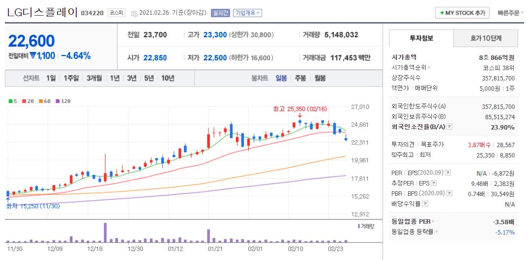 LG디스플레이의 2월 26일 주가는 22,600원이고