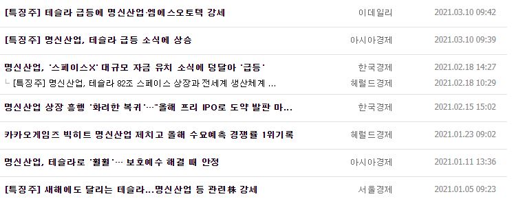 특히, 엘론 머스크의 스페이스X 대규모 자금 유치로 인해 명신산업도 강세를 보이고 있는데요, 강판을 고온으로 가열한 뒤 급속으로 냉동한 뒤 모양을 만들어내는 기술을 토대로 차량용 차체 부품을 생산하고 있다고 합니다.