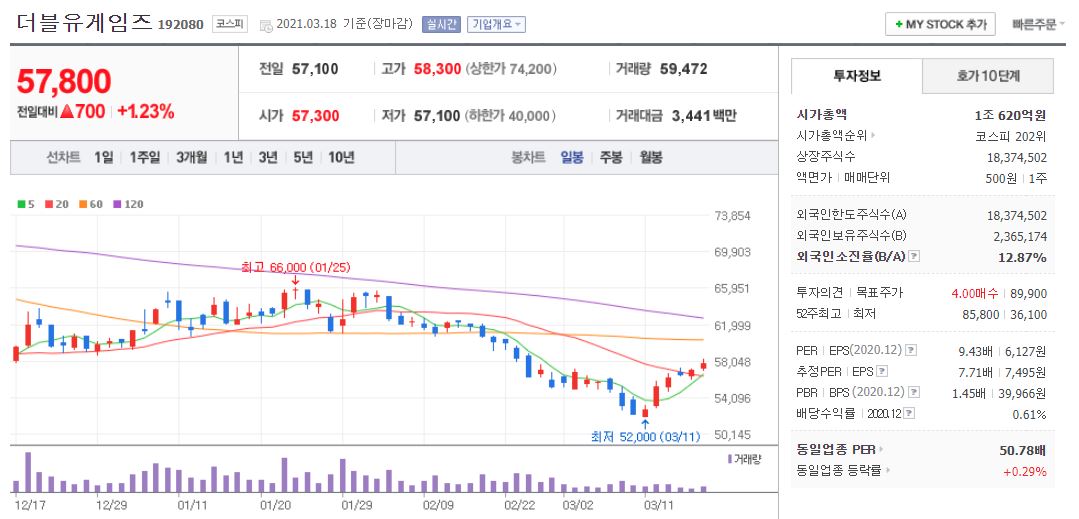 더블유게임즈는 3월 18일 기준, 시가 총액은 1조 620억원으로 코스피 202위이고, 주가는 57,800원이었습니다. 상장 주식수는 18,374,502주고 액면가는 500원 단위네요.