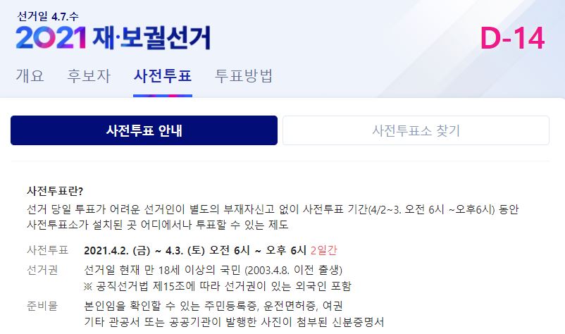 2021년 재보궐선거 사전 투표는 4월 2일 금요일부터 4월 3일 토요일까지, 오전 6시~오후 6시까지가능합니다. 투표와 동일하게 본인을 확인할 수 있는 주민등록증, 운전면허, 여권 등만 있으면 됩니다. 중앙선거관리위원회나 네이버에 사전투표소 찾기로 검색하시면, 해당 지역 내에 투표소 위치를 확인할 수 있습니다.