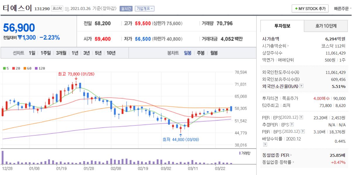 삼성전자, 인텔과 거래하는 두 번째 기업은 티에스이입니다. 3월 26일 기준, 시가총액 6,294억원, 코스닥 112위 기업입니다. 상장 주식수는 11,061,429주에 액면가는 500원 단위로, 주가는 56,900원으로 마감됐네요. 네이버 금융의 펀더멘털에 따르면 20년 PER는 23.19배, 21년 PER는 13.42배입니다. 매출액과 영업이익, 당기 순이익은 지속적으로 상승하고 있고 부채비율도 30% 수준으로 월덱스보다 더 낮은 수준입니다.