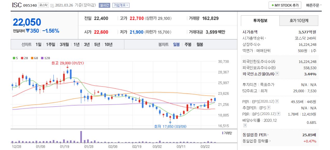 삼성전자, 인텔과 거래하는 세 번째 기업은 ISC입니다. 3월 26일 기준, 시가총액 3,577억원, 코스닥 249위 기업입니다. 상장 주식수는 16,224,248주에 액면가는 500원 단위로, 주가는 22,050원으로 마감됐네요. 네이버 금융의 펀더멘털에 따르면 20년 PER는 49.50배입니다. 매출액과 영업이익, 당기 순이익은 19년에 주춤했지만 상승하고 있고 부채비율도 30% 수준입니다.