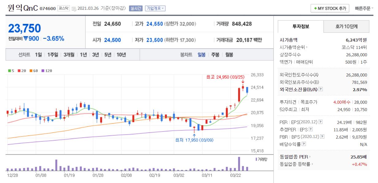 삼성전자, 인텔과 거래하는 네 번째 기업은 원익Qnc입니다. 3월 26일 기준, 시가총액 6,243억원, 코스닥 114위 기업입니다. 상장 주식수는 26,299,000주에 액면가는 500원 단위로, 주가는 23,750원으로 마감됐네요. 네이버 금융의 펀더멘털에 따르면 20년 PER는 24.18배, 21년 PER는 11.84입니다. 매출액과 영업이익, 당기 순이익은 19년에 약간 하락했으나 전체적으로 상승하고 있고 부채비율은 119% 수준입니다.