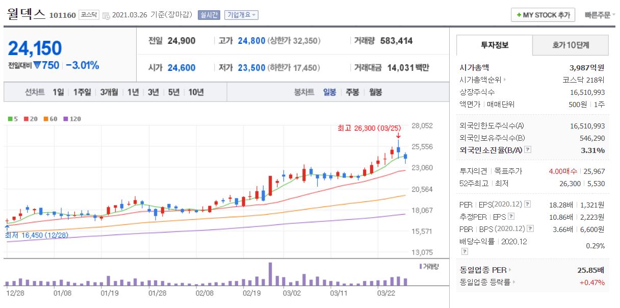 삼성전자, 인텔과 거래하는 첫 번째 기업은 월덱스입니다. 3월 26일 기준, 시가총액 3,987억원, 코스닥 218위 기업입니다. 상장 주식수는 16,510,993주에 액면가는 500원 단위로, 주가는 24,150원으로 마감됐네요. 네이버 금융의 펀더멘털에 따르면 20년 PER는 18.28배, 21년 PER는 10.86배입니다. 매출액과 영업이익, 당기 순이익은 지속적으로 상승하고 있고 부채비율도 약 60% 수준으로 건전하다고 보입니다.