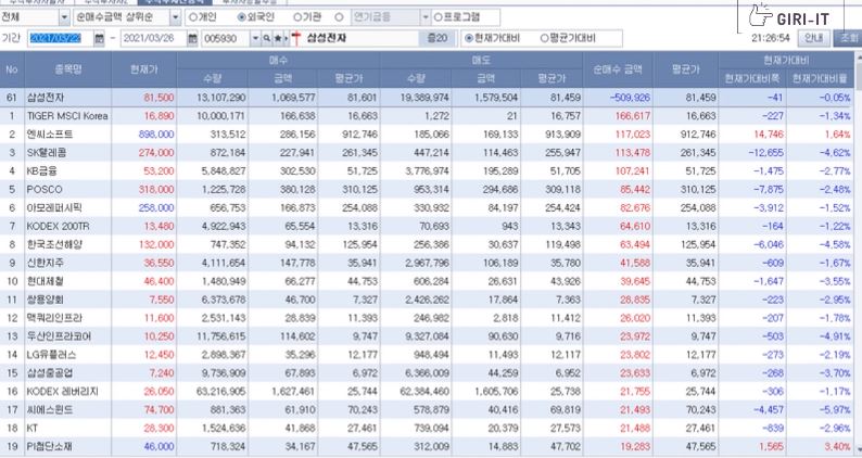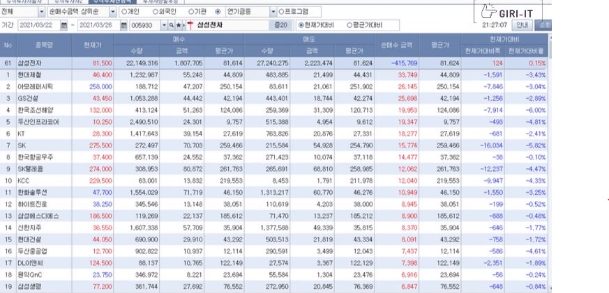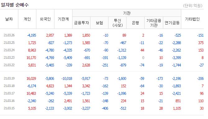 21년 3월 22일 월요일부터 3월 26일 금요일까지 개인은 약 2조원 정도를 매수했고, 외국인은 목요일까지 1조 5천억원을 매도했다가 금요일에만 약 3,000억원을 매수했습니다. 기관 역시 목요일까지 1조 1,300억원 정도를 매도하다가 금요일 하루만 1,389억원을 매수했습니다. 연기금은 이번 주에 약 1조를 매도 중이네요. 확실히 개인의 매수세가 최근에는 두드러지는 거 같습니다.