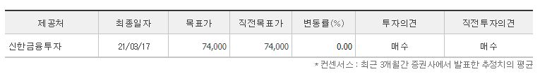 21년 3월 신한금융투자에서 제시한 투자의견만 1개 있었는데요. 목표가 74,000원이었습니다.