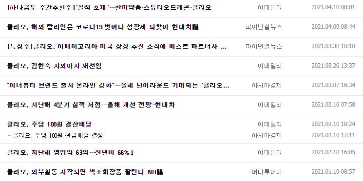 클리오는 사실 최근 염블리신 염승환 부장님께서 언급한 적이 있는 회사인데요. 1993년 국내 최초 탄생한 색조 전문 브랜드로 클럽 클리오라는 오프라인 매장을 운영하고 있습니다. 지난1,4분기 매출액과 영업이익을 599억원, 27억원으로 전망하면서 실적 자체는 전년 동기보다는 감소했지만 직전 분기 비교 시 증가한 수치라고 합니다. 현대차 증권에서는 클리오 매장 축소에 따른 매출액 감소는 불가피하지만 온라인과 글로벌 채널 실적 성장세가 강화되고 내수 채널 효율성도 전년 대비 향상할 것으로 전망하기도 했습니다. 하나금투에서도 하반기 가파른 이익 개선 등을 전망하기도 했네요.