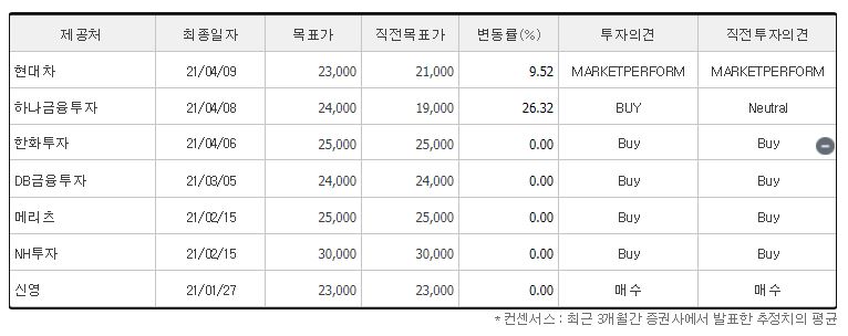 21년 1월부터 7개의 증권사에서 목표가를 제시했었는데요. 전체적으로 투자의견은 매수를 유지하고 있는 것이 보이고, 제일 낮게 제시한 곳은 현대차와 신영의 목표가 23,000원이었고 가장 높은 곳은 NH투자의 30,000원인 것을 확인할 수 있었습니다. 참고로 네이버 금융의 투자의견 컨센서스에 목표주가 24,857원에 매수로 잡혀있네요.