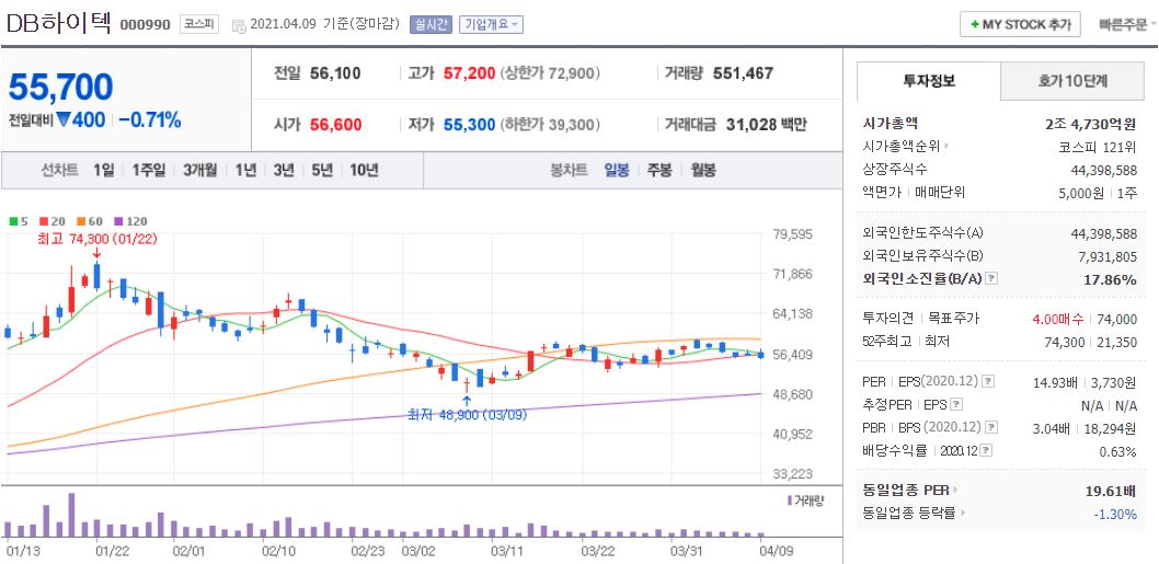 DB하이텍의 경우 21년 4월 9일 기준, 55,700원이며 시가총액 2조 4,730억원, 코스피 121위의 기업입니다. 상장주식수는 44,398,588주에 액면가 5,000원이고 네이버 금융의 펀더멘털을 보면 20년 PER는 14.93배, 21년 PER는 15.09배입니다. 재무제표 요약을보면 18년부터 21년까지 매출액, 영업이익, 당기순이익은 상승하는 추세이며 부채비율도 18년 91% 수준에서 최근 약 40% 수준까지 낮아졌습니다.