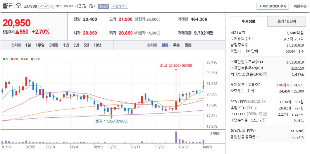 클리오의 경우 21년 4월 9일 기준, 20,950원이며 시가총액 3,606억원, 코스닥 261위의 기업입니다. 상장주식수는 17,210,819주에 액면가 500원이고 네이버 금융의 펀더멘털을 보면 20년 PER는 37.34배, 21년 PER는 28.81배입니다. 재무제표 요약을 보면 18년부터 21년까지 매출액은 2,000억원 대이며, 영업이익은 흑자지만 19년 186억원에서 20년에는 62억원으로 감소했다가 21년 영업이익은 148억원 수준입니다. 당기순이익은 18년부터 지속적으로 상승하는 추세입니다. 부채비율도 18년부터 약 40% 수준이네요.