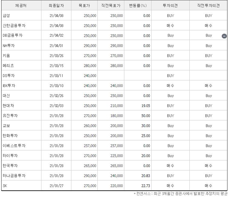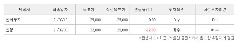 21년 2월과 3월에 2개의 증권사에서 목표가를 제시했었는데요. 전체적으로 투자의견은 매수를 유지하고 있는 것이 보이고, 제일 낮게 제시한 곳은 신영의 목표가 22,000원이었고 가장 높은 곳은 한화투자의 25,000원인 것을 확인할 수 있었습니다. 다만, 신영의 경우 직전 목표가인 25,000원보다 12% 낮은 수치네요. 참고로 네이버 금융의 투자의견 컨센서스에 목표주가는 23,500원입니다.