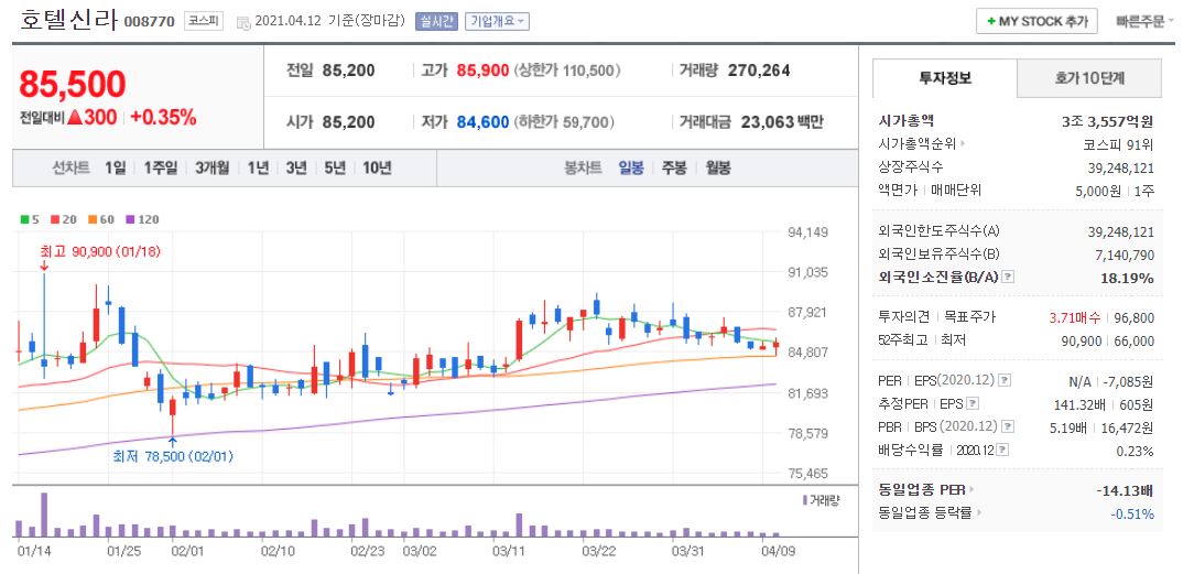 호텔신라의 경우 21년 4월 12일 기준, 85,500원이며 시가총액 3조 3,557억원, 코스피 91위의 기업입니다. 상장주식수는 39,248,121주에 액면가 5,000원이고 네이버 금융의 펀더멘털을 보면 21년 PER는 140.92배입니다. 재무제표 요약을 보면 아무래도 코로나19로 인해 20년 매출액은 약 2조 이상 줄어들었고 영업이익과 당기순이익은 마이너스입니다. 그렇지만 21년 영업이익과 당기순이익은 흑자로 전환되는 추세입니다. 그렇지만 부채비율은 19년에 283%, 20~21년은 300% 이상으로 높은 수준입니다.