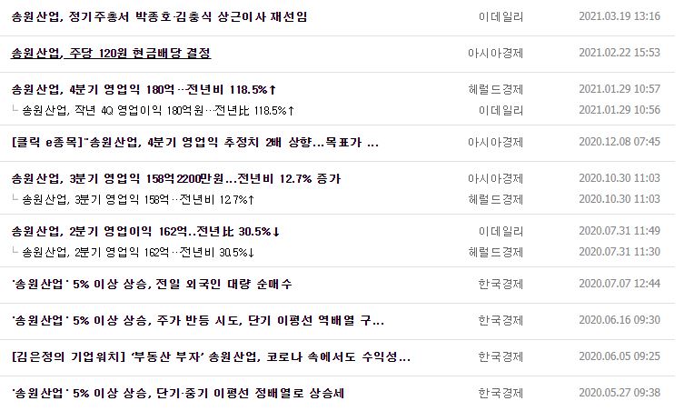 송원산업은 작년 12월 31일 기준, 주당 120원의 현금 배당을 한 기업인대요. 작년 4분기 연결기준 영업이익이 179억 5,500만원으로 전년 동기 대비 118.5%가 증가했고, 매출액은 3.4% 늘어났다고 합니다. 다만 아쉬운 건 3월에 상근이사 재선임 이외에는 별다른 이슈 사항들이 없는 게 아쉽네요.