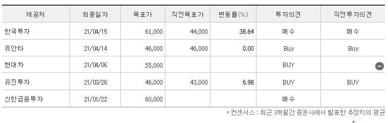 21년에 5개의 증권사에서 목표가를 제시했었는데요. 전체적으로 투자의견은 매수를 유지하고 있는 것이 보이고, 제일 낮게 제시한 곳은 유안타와 유진투자의 목표가 46,000원이었고 가장 높은 곳은 한국투자의 61,000원인 것을 확인할 수 있었습니다. 참고로 네이버 금융의 투자의견 컨센서스에 목표주가는 53,600원입니다.