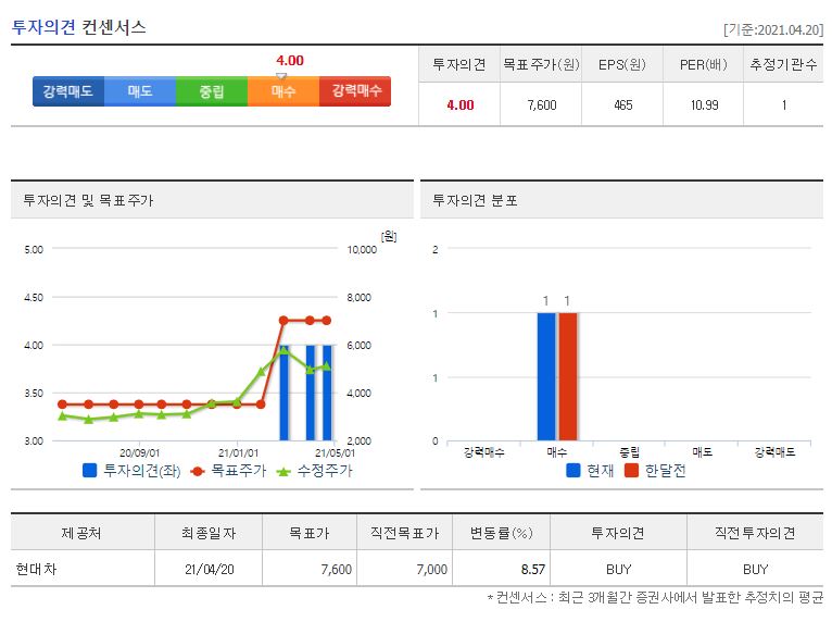 21년 4월 20일에 현대차에서 목표가 7,600원에 투자의견 매수로 제시했습니다. 21일 기준으로 보면 염승환 부장님의 목표가까지 530원 정도, 현대차 목표가까지는 1,130원 정도의 여유가 있네요,.