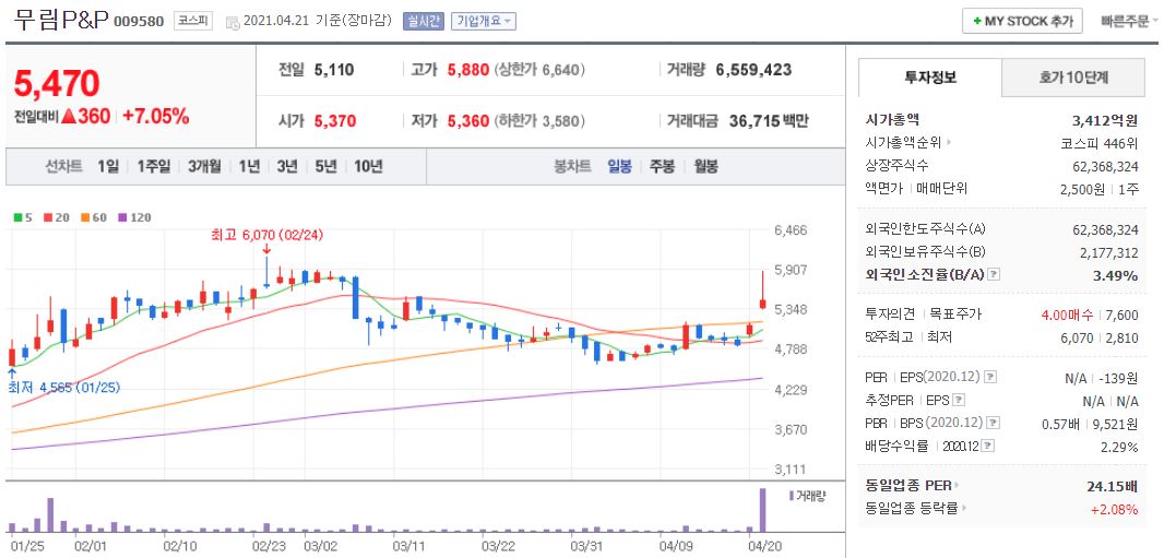 무림P&P의 경우 21년 4월 21일 기준, 5,470원이며 시가총액 3,412억원, 코스피 446위의 기업입니다. 상장주식수는 62,368,324주에 액면가 2,500원이고 네이버 금융의 펀더멘털을 보면 21년 PER는 10.99배입니다. 재무제표 요약을 보면 18년부터 20년까지 매출액, 영업이익, 당기순이익은 지속적으로 하락하고 있습니다. 다만, 21년에는 다시 상승했네요. 참고로 부채비율은 약 110% 수준이며 현금배당금은 20년 기준 1주당 125원입니다.