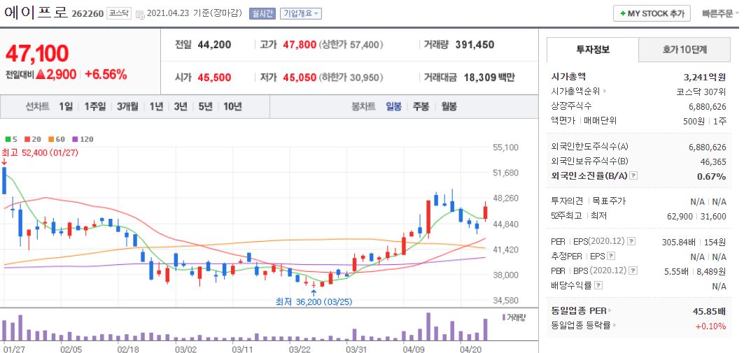 에이프로의 경우 21년 4월 23일 기준, 47,100원이며 시가총액 3,241억원, 코스닥 307위의 기업입니다. 상장주식수는 6,880,626주에 액면가 500원이고 네이버 금융의 펀더멘털을 보면 20년 PER는 305.30배입니다. 2차 전지 관련된 기업들은 정말 PER가 높다는 걸 새삼 느끼게 됩니다. 재무제표 요약을 보면 매출액은 18년부터 약 600억 수준이고, 올해는 조금 감소한 490억원 정도 입니다. 영업이익과 당기순이익도 흑자지만 올해는 많이 감소된 것을 알 수 있었습니다. 부채비율은 18년 367%에서 20년에는 26%까지 엄청나게 감소한 것을 알 수 있고 현금 배당금은 별도로 없었습니다.