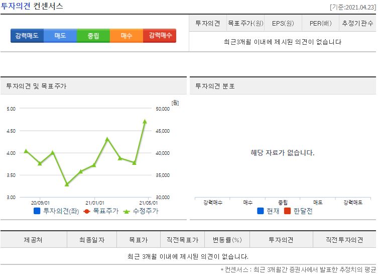 2021년에는 증권사에서 제시한 목표가는 없었습니다. 그런 점은 아쉽지만 염부장님의 목표가 50,000원을 기준으로 본다면 4월 23일 기준 47,100원이기 때문에 상승여력은 2,900원 정도 남은 것 같습니다.