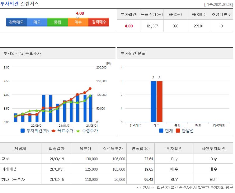 21년에는 3개의 증권사에서 목표가를 제시했었는데요. 제일 낮게 제시한 곳은 2월에 하나금융투자에서 제시한 110,000원이었고 제일 높게 제시한 곳은 4월에 교보에서 발표한 130,000원입니다. 참고로 네이버 투자의견 컨센서스는 121,667원입니다. 4월 23일 기준 엘앤에프가 97,500원이니까 최저가 대비해서는 12,500원 정도 최대가 대비해서는 32,500원의 상승여력이 있겠네요.