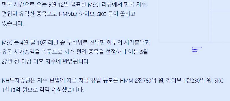 MSCI 리벨런싱 편입 예상종목(HMM, 하이브, SKC, 녹십자, 카카오게임즈 등)