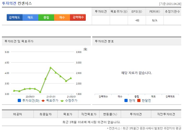 2021년에는 목표가를 제시한 증권사는 별도로 없었습니다. 다만, 별도의 모멘텀 있는 것도 아니고 재무제표 등의 수치가 워낙 좋지 않아서 신중히 검토해보셔야 할 것 같습니다.